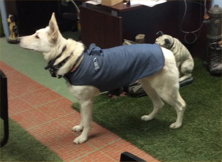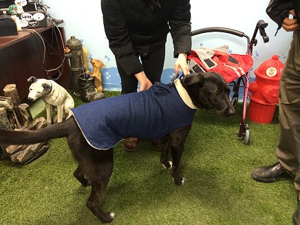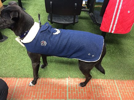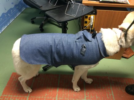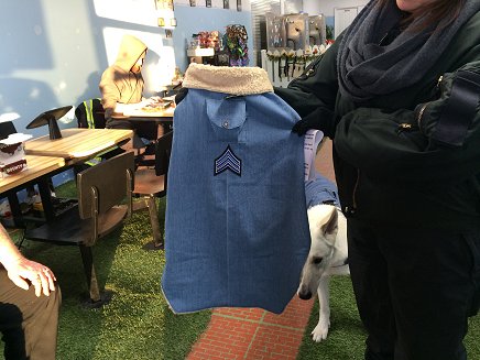 Diesel is loving his new coat. Here you see the coat before the personalization patches were added and after. The coat is made of dark blue denim (2) with an off white sheepskin lining (6) for warmth.