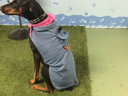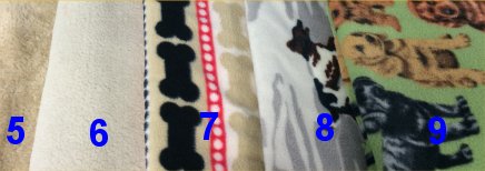 Lola loves her new coat. It is a light blue denim (3) and lined with a green fleece with puppies on it (9). Then she finishes off her image with a bandana in pink.