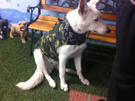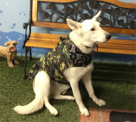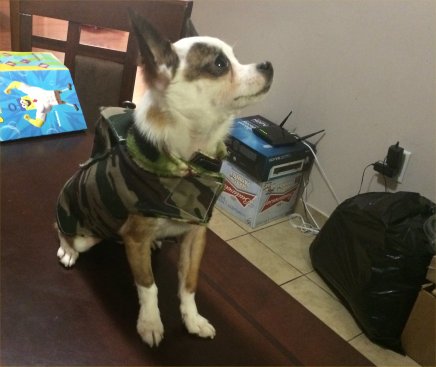 Rex is so tiny that it's hard to see it, but his coat is camouflage (11) lined with a soft green camouflage fleece interior (4). We hope it helps you stay warm there little buddy.
