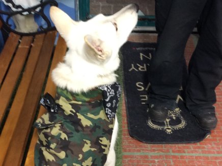 Bella is showing off her new camouflage coat (8) with sargeant stripes added on to personalize it just for her. The gold bars look pretty cool against the green. The coat is lined with a soft green camouflage fleece (4).