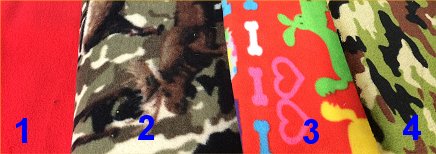 Here Bella is modelling a coat that was ordered, but the dog was not available to model for us. It is a nice camouflage denim exterior (11) with a soft and cozy green camouflage fleece (4)lining.